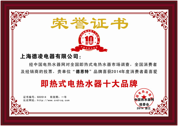 上海德凌電器有限公司經(jīng)中國電熱水器網(wǎng)對全國即熱式電熱水器市場調查,全國消費者及經(jīng)銷商投票,“德恩特”品牌喜獲“2014年度消費者最喜愛即熱式電熱水器十大品牌”并連續(xù)4年獲得排名第一。
